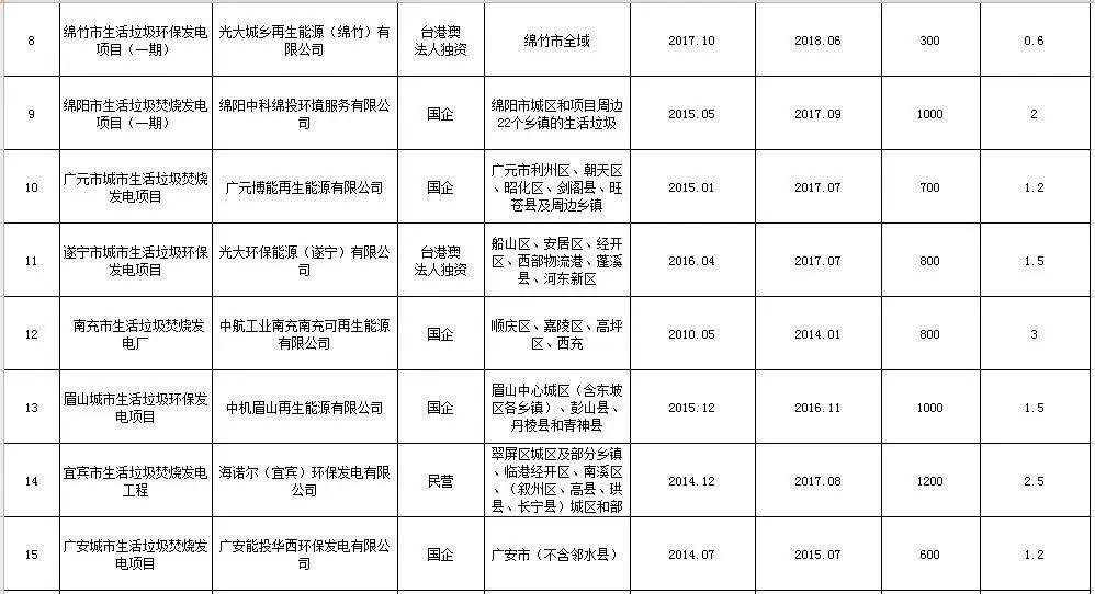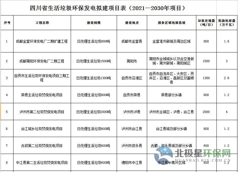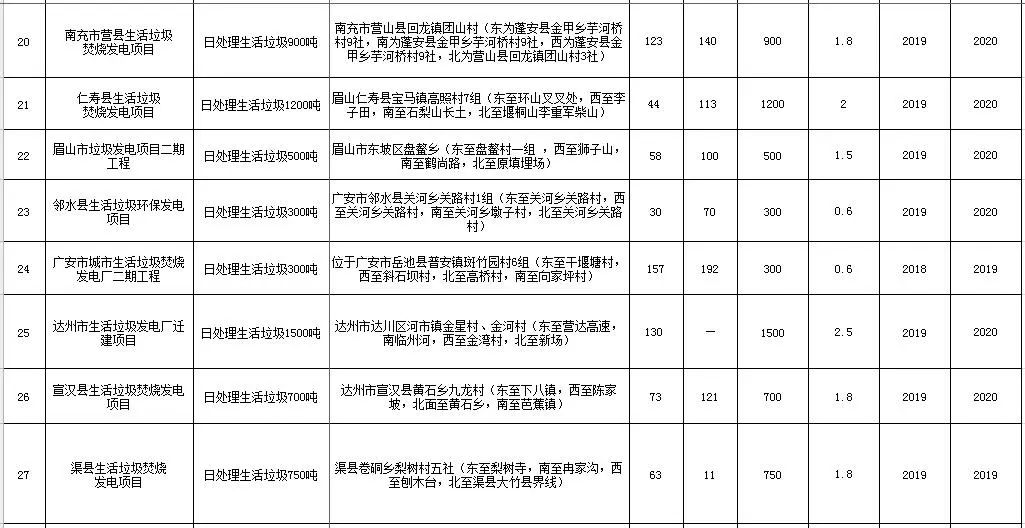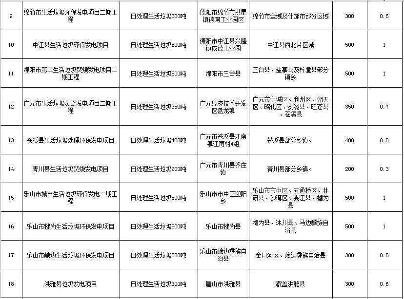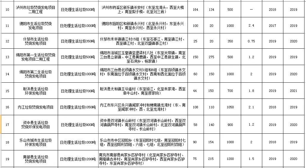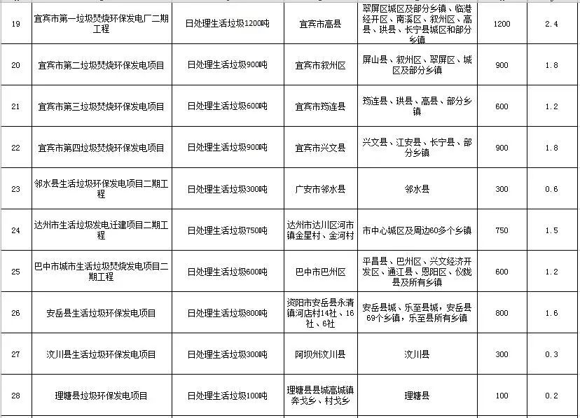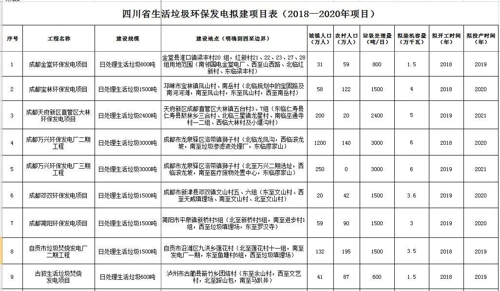 2019年7月,四川印發(fā)《四川省生活垃圾焚燒發(fā)電中長期專項(xiàng)規(guī)劃》?!兑?guī)劃》提出到2030年累計實(shí)施生活垃圾焚燒發(fā)電項(xiàng)目80個,日處理生活垃圾7.105萬噸。其中,2018—2020年新建生活垃圾焚燒發(fā)電項(xiàng)目22個、擴(kuò)建8個,2021—2030年新建生活垃圾焚燒發(fā)電項(xiàng)目20個、擴(kuò)建12個,總規(guī)模5.265萬噸/日,總投資估算約238億元。