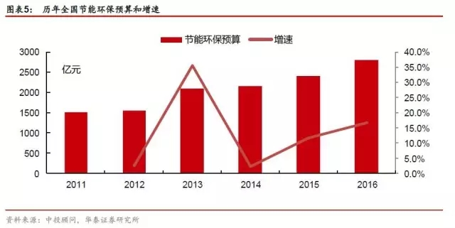 政府是環(huán)保投資的主體,全國(guó)每年環(huán)保投資額達(dá)數(shù)千億元,占到同期GDP的1%以上,政府環(huán)保行業(yè)財(cái)政投資也在不斷增加,2016 年環(huán)保行業(yè)財(cái)政預(yù)算支出達(dá)2932億元,并且實(shí)際支出大于預(yù)算。