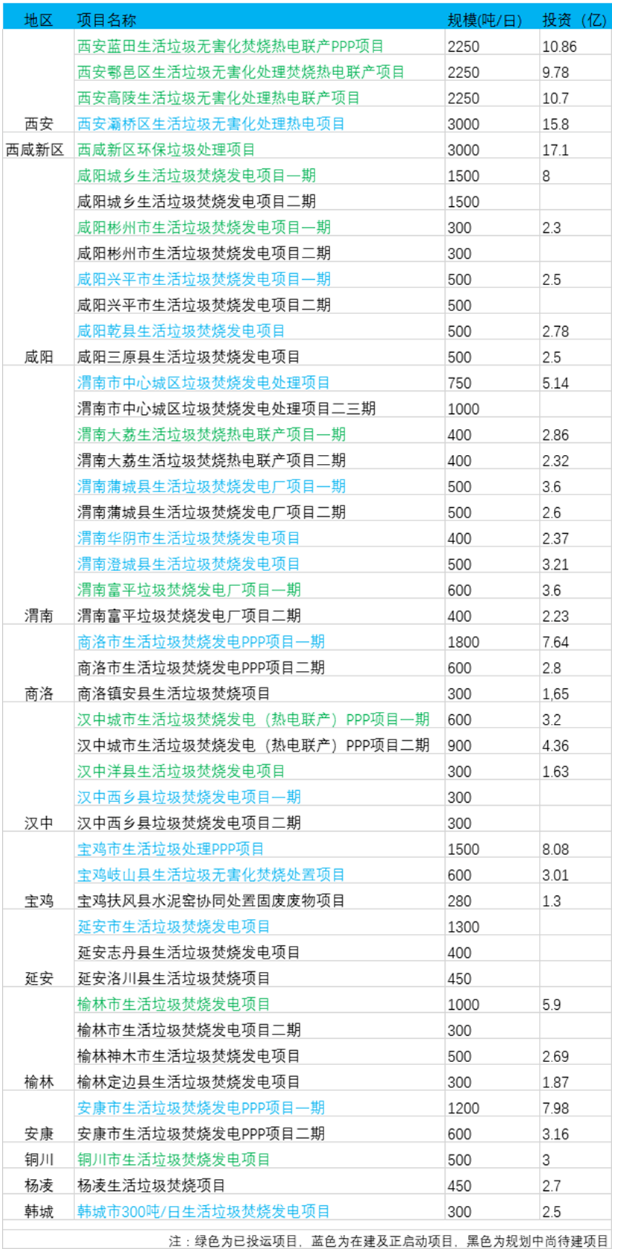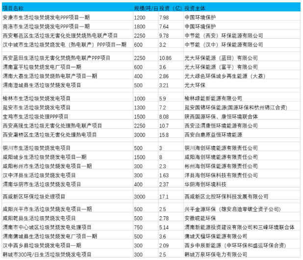 另外網(wǎng)上可查的已經(jīng)開始招標(biāo)以及建設(shè)過程中的項目有14個,總投資金額73.9億元,日處理規(guī)模超過1.3萬多噸。其中西安灞橋區(qū)生活垃圾無害化處理熱電項目規(guī)劃日處理3000噸,與西咸新區(qū)項目并列為陜西最大規(guī)模的生活垃圾焚燒項目,其中一期750噸去年底已經(jīng)點火試運行。真正投運后,即使不包含西咸新區(qū),西安市的日垃圾焚燒規(guī)模也將超過一萬噸。另外商洛市生活垃圾焚燒發(fā)電PPP項目、寶雞市生活垃圾處理PPP項目、延安市生活垃圾焚燒發(fā)電項目規(guī)劃日處理規(guī)模均超過千噸。如下圖﹕