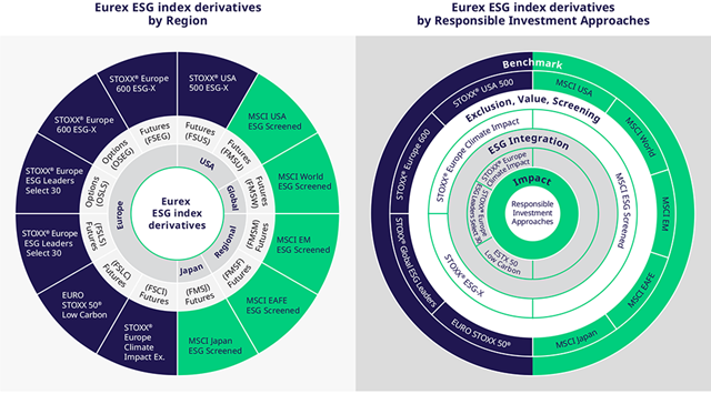 現(xiàn)階段,國(guó)際市場(chǎng)上基于ESG指數(shù)開發(fā)的衍生金融產(chǎn)品發(fā)展主要呈現(xiàn)出如下特點(diǎn)和趨勢(shì):一是品種工具逐漸健全,已成為一種新型指數(shù)衍生品類別。如圖5所示,Eurex交易所推出了各類追蹤ESG指數(shù)的相應(yīng)期權(quán)、期貨產(chǎn)品。此外,國(guó)際上最新發(fā)布了多只基于ESG指數(shù)開展的創(chuàng)新型衍生金融產(chǎn)品,包括BlackRock發(fā)布的iShares Core MSCI Australia ESG Leaders ETF(IESG)、BNP Paribas推出的BNP Paribas Easy Low Carbon 300 World PAB UCITS ETF以及J.P. Morgan 推出的名為JPM UK Sustainable Equity和JPM Global Sustainable Equity的兩個(gè)可持續(xù)主題OEIC等。二是交易所在選取標(biāo)的指數(shù)時(shí)多立足當(dāng)?shù)厥袌?chǎng),且依據(jù)客戶需求推出定制化服務(wù)。例如,ICE美國(guó)在選取標(biāo)的指數(shù)時(shí)既立足全球,也扎根美國(guó)市場(chǎng);Nasdaq曾表示除現(xiàn)有指數(shù)期貨外,還將致力于推出客戶“定制型”ESG衍生品。