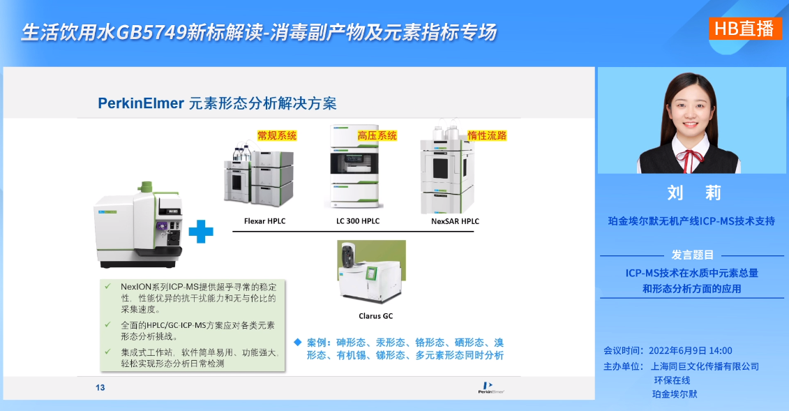 珀金埃爾默無機(jī)產(chǎn)線ICP-MS技術(shù)支持劉莉介紹了ICP-MS技術(shù)在水質(zhì)檢測方面的應(yīng)用,劉莉從GB 5749和GB 5750的變化展開,介紹了GB5749與舊版相比更新的內(nèi)容,新標(biāo)準(zhǔn)的水質(zhì)指標(biāo)由106項調(diào)整為97項,水質(zhì)參考指標(biāo)由28項增加到55項。隨后劉莉介紹了針對ICP-MS技術(shù)在水質(zhì)中元素總量和形態(tài)分析方面珀金埃爾默的特色方案,如智能電子稀釋技術(shù)。隨后,劉莉介紹了GB 5750元素分析最大變化——增加元素形態(tài)分析方法,珀金埃爾默在元素形態(tài)分析方面也有著豐富的解決方案。NexION系列ICP-MS提供超常的穩(wěn)定性,性能優(yōu)異的抗干擾能力和出色的采集速度;全面的HPLC/GC ICP-MS方案應(yīng)對各類元素形態(tài)分析挑戰(zhàn);集成式工作站,軟件簡單易用、功能強(qiáng)大,輕松實現(xiàn)形態(tài)分析日常檢測。