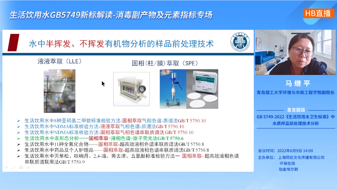 青島理工大學(xué)環(huán)境與市政工程學(xué)院副院長,校分析測試中心主任馬繼平主要介紹了GB 5749新標(biāo)準(zhǔn)中有關(guān)重金屬和有機(jī)物以及形態(tài)分析方面的水質(zhì)樣品前處理技術(shù),重點介紹了測定水中消毒副產(chǎn)物等有機(jī)物的樣品前處理技術(shù)。馬主任這場匯報內(nèi)容詳實具體、知識點滿滿,小編提煉重點如下: