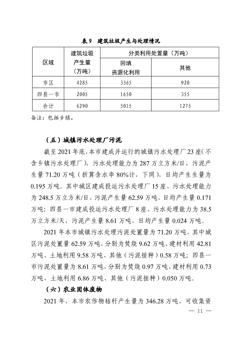 做好生活垃圾處理。2021年,全市城鄉(xiāng)生活垃圾產(chǎn)生量為305.4萬(wàn)噸,其中餐廚垃圾12.1萬(wàn)噸。全市共建成居民區(qū)垃圾分類定時(shí)定點(diǎn)集中投放點(diǎn)4311座,共有垃圾焚燒處理廠6座,總處理能力為346.75萬(wàn)噸/年,餐廚垃圾資源利用處理設(shè)施3座。全部垃圾填埋場(chǎng)已于2021年4月全部封場(chǎng),實(shí)現(xiàn)原生垃圾零填埋,無害化處理率達(dá)到100%。