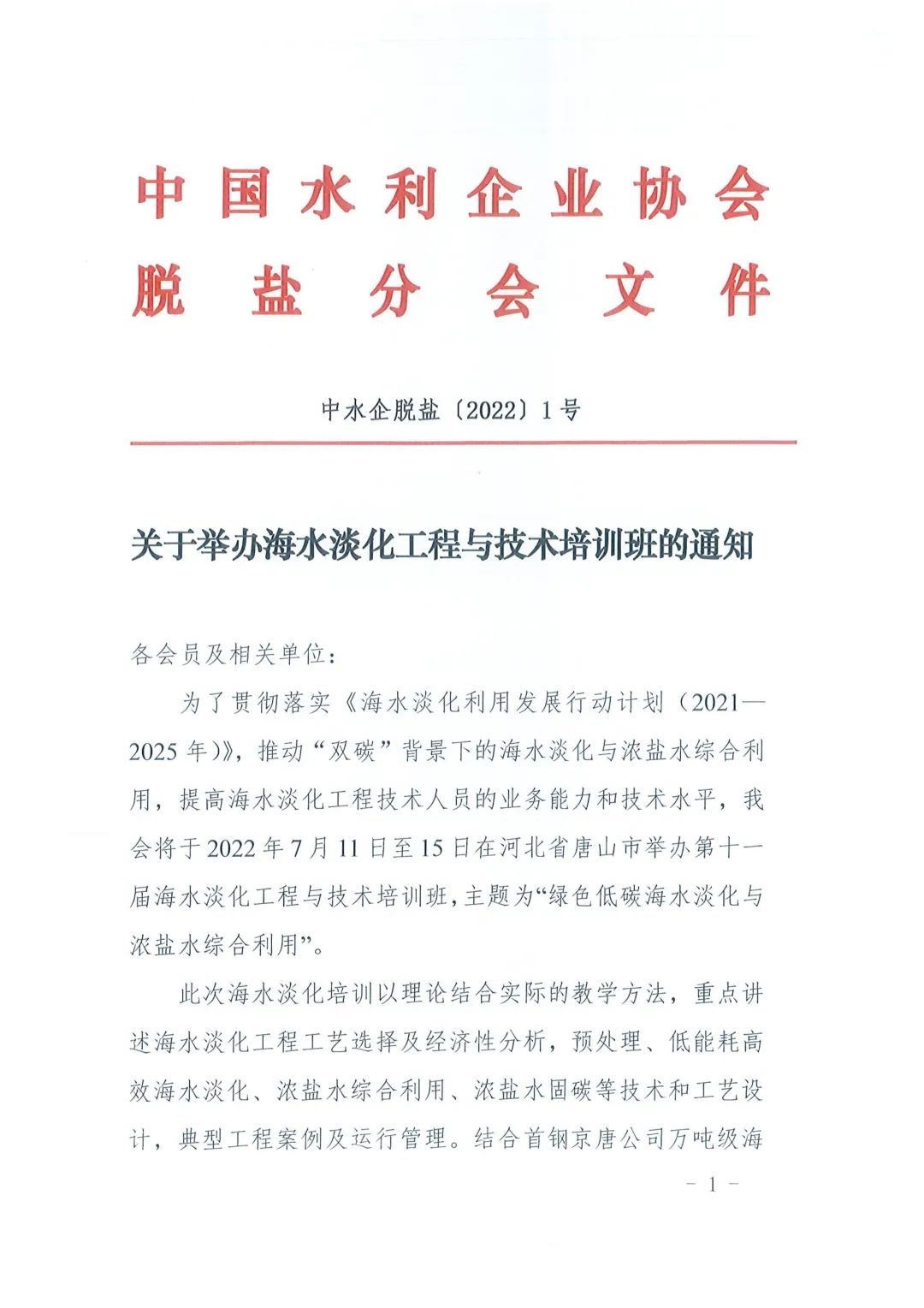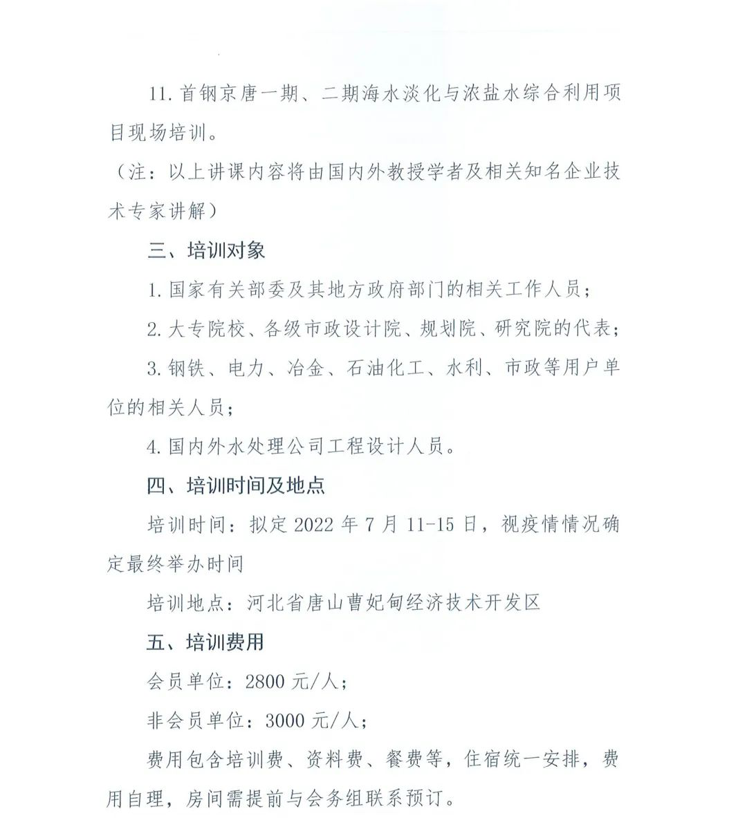為了貫徹落實《海水淡化利用發(fā)展行動計劃(2021—2025年)》,推動“雙碳”背景下的海水淡化與濃鹽水綜合利用,由中國水利企業(yè)協(xié)會脫鹽分會主辦的第十一屆海水淡化工程與技術培訓班計劃于2022年7月11日至15日在河北省唐山市曹妃甸區(qū)舉辦,本屆海水淡化培訓班的主題是“綠色低碳”海水淡化與濃鹽水綜合利用,課程內容豐富充實,教學質量專業(yè)。此次培訓以理論結合實踐的教學方法,結合首鋼京唐公司“燃-熱-電-水-鹽”五效一體高效循環(huán)利用技術現場進行實踐教學。