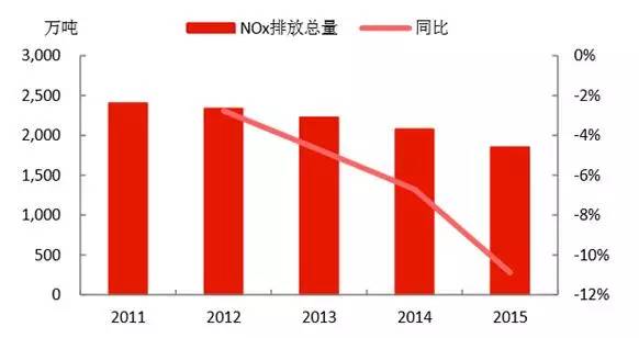 NOx的排放量為1852萬噸,“十二五”剛開始治理,當前的下降速度還處于上升趨勢,收關(guān)年2015年下降速度高達10.89%。