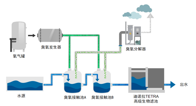 結(jié)合迪諾拉專(zhuān)長(zhǎng)的生物活性過(guò)濾技術(shù)和臭氧技術(shù),使用更少的臭氧投加量進(jìn)行部分氧化之后,將更小的可生物降解的有機(jī)物化合物通過(guò)下游的BAF工藝進(jìn)行進(jìn)一步去除,用于市政飲用水給水中微污染物的去除和消毒副產(chǎn)物的減少。