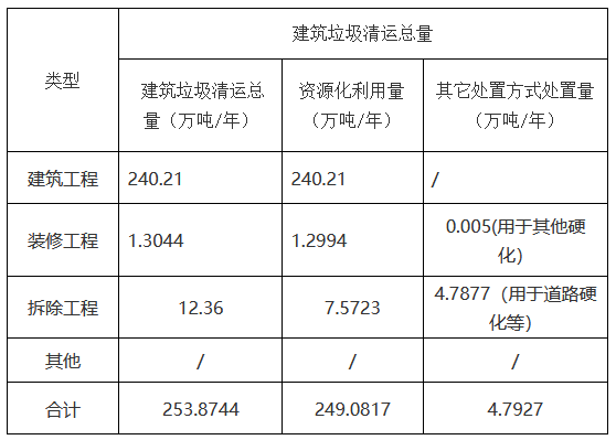 3.淮北市建筑垃圾全市合計(jì)253.8744萬噸,其中249.0817得到有效資源化利用,利用率98.11%。