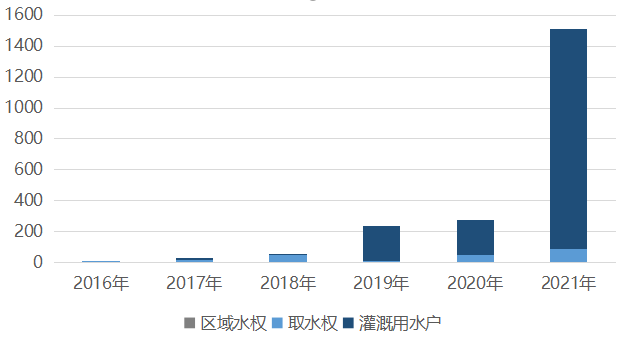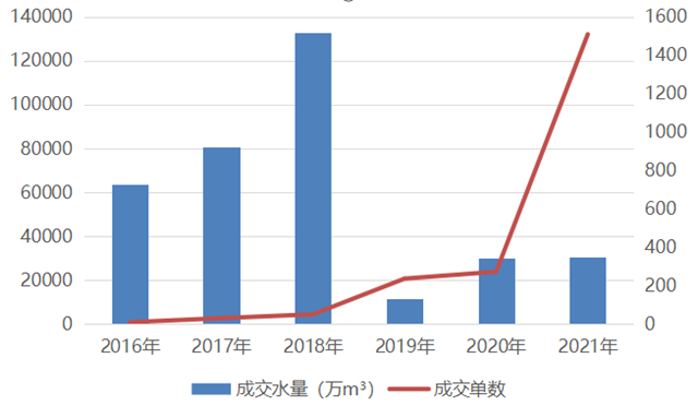 整體而言,2021年成交水量約3億立方米,與2020年成交水量基本相同;同時成交單數(shù)大幅增長,由2020年的273筆大幅提高至1510筆,顯示交易活躍度顯著改善,覆蓋范圍進(jìn)一步擴大。