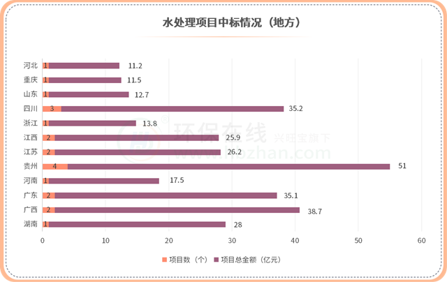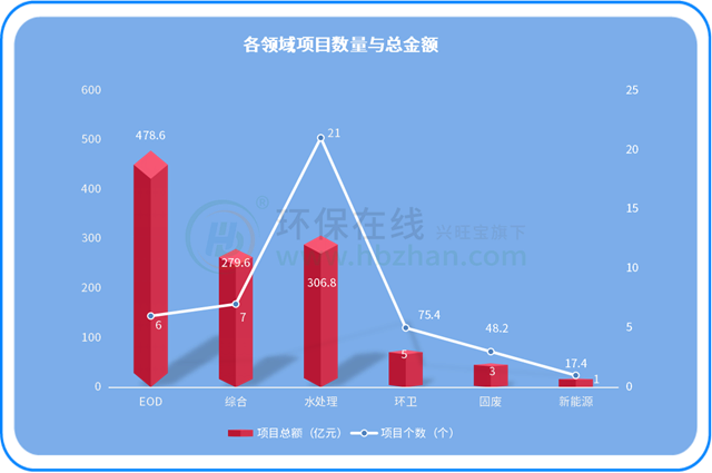 圖中也可以看出,水處理項(xiàng)目仍然是最多的類別,不過(guò)EOD項(xiàng)目以及生態(tài)環(huán)境綜合項(xiàng)目雖然數(shù)量少,但項(xiàng)目金額相當(dāng)可觀。