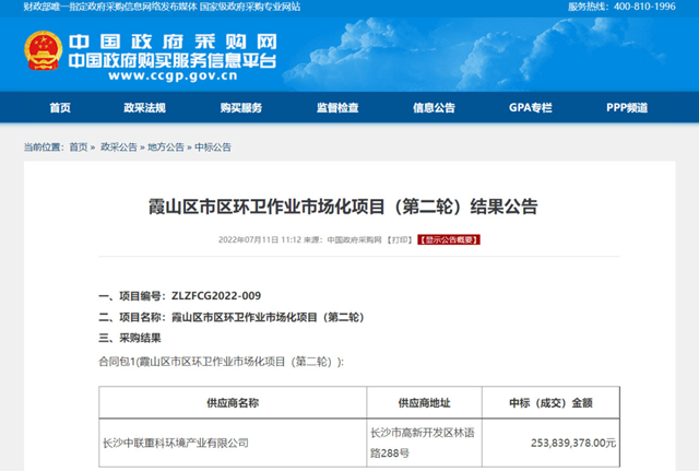 經(jīng)歷了去年的短暫下滑之后,盈峰環(huán)境在2022年上半年迎來爆發(fā)。7月11日,中國政府采購網(wǎng)發(fā)布廣東省湛江市霞山區(qū)市區(qū)環(huán)衛(wèi)作業(yè)市場化項目(第二輪)結(jié)果公告,長沙中聯(lián)重科環(huán)境產(chǎn)業(yè)有限公司中標,中標金額2.53839378億元,項目服務期為3年。