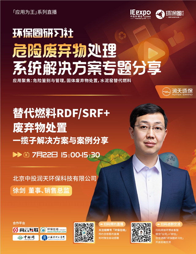 7月22日(星期五)下午14:00-15:30,環(huán)保圈研習(xí)社“應(yīng)用為王”系列直播,危險(xiǎn)廢棄物處理系統(tǒng)解決方案專題分享,我們有幸邀請(qǐng)到了上?;ぴ?、北京恩薩、潤(rùn)天環(huán)保3家企業(yè)的技術(shù)專家做客直播間,與我們共同探討危險(xiǎn)廢棄物的鑒別與管理,危廢焚燒預(yù)處理,水泥窯協(xié)同處置等技術(shù)及相關(guān)解決方案。