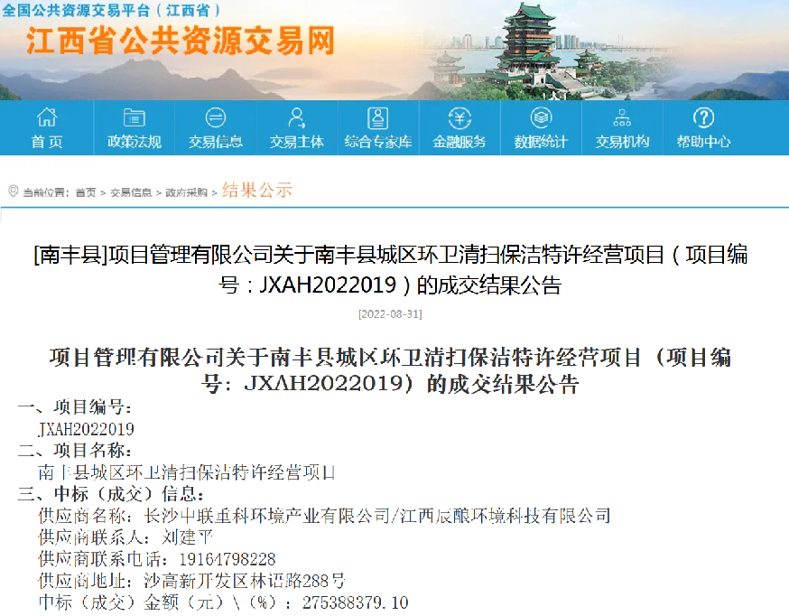 江西省公共資源交易中心消息,8月31日,南豐縣城區(qū)環(huán)衛(wèi)清掃保潔特許經(jīng)營項目公布開標結(jié)果,中標情況如下: