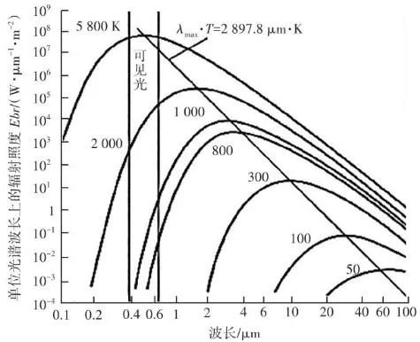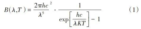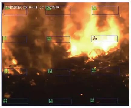 根據(jù)普朗克(Plank)黑體輻射定律,自然界的任何物體只要溫度高于絕對(duì)零度(-273.15 ℃),就會(huì)以電磁輻射的形式在非常寬的波長(zhǎng)范圍內(nèi)發(fā)射能量,產(chǎn)生電磁波(輻射能)。不同的材料、溫度、表面光度及顏色,發(fā)出的紅外輻射強(qiáng)度都不同,大氣電磁光譜示意見(jiàn)圖4。普朗克輻射定律給出了黑體輻射的具體譜分布,在一定溫度下,單位面積的黑體在單位時(shí)間、單位立體角內(nèi)和單位波長(zhǎng)間隔內(nèi)輻射出的能量見(jiàn)公式(1):式中:B(λ,T)為黑體的光譜輻射亮度(W?m-2?Sr-1?μm-1);T為黑體的絕對(duì)溫度(K);c為光速,c=2.998×108 m/s;h為普朗克常數(shù),h=6.626×10-34 J?s;K為波爾茲曼常數(shù),K=1.380×10-23 J/K。在一定溫度下,黑體的光譜輻射亮度存在一個(gè)極值,這個(gè)極值的位置與溫度有關(guān),這就是維恩位移定律(Wien):式中:λmax為最大黑體光譜輻射亮度處的波長(zhǎng)(μm);T為黑體的絕對(duì)溫度(K);b為維恩常量,b=0.002 897 m·K(2.897×103μm·K)。根據(jù)Wien定律,我們可以估算,當(dāng)T=6 000 K時(shí),λmax為0.48 μm(綠色),這就是太陽(yáng)輻射中大致的最大光譜輻射亮度處。當(dāng)T=300 K,λmax=9.6 μm,這就是地球物體輻射中大致最大光譜輻射亮度處。普朗克定律描述的黑體輻射在不同溫度下的頻譜見(jiàn)圖5。根據(jù)圖5中數(shù)據(jù),可以得到如下結(jié)論:隨著溫度升高,輻射能量增加,這是紅外輻射理論的出發(fā)點(diǎn),也是單波段紅外測(cè)溫設(shè)計(jì)的依據(jù)。隨著溫度升高,輻射峰值波長(zhǎng)向短波方向移動(dòng),其規(guī)律符合Wien定律,即λmax?T=2 897.8 μm?K。這個(gè)公式解釋了為什么“高溫測(cè)溫儀”多采用短波,“低溫測(cè)溫儀”多采用長(zhǎng)波。輻射能量隨溫度的變化率,短波比長(zhǎng)波大,即短波處工作的“測(cè)溫儀”相對(duì)信噪比高,抗干擾性強(qiáng)。由Wien定律可以得出,溫度越高,輻射峰值的波長(zhǎng)越短。所以為了使輻射接收器有一個(gè)較理想的信噪比,對(duì)于溫度越低的物體,可測(cè)量的輻射波長(zhǎng)越長(zhǎng)。近年來(lái),利用光電轉(zhuǎn)換元件(Charge Coupled Device,CCD),即“電荷耦合元件”測(cè)量和監(jiān)測(cè)火焰溫度的方法受到越來(lái)越多的關(guān)注,國(guó)內(nèi)外先后開(kāi)展了大量研究。CCD用于將鏡頭收集到的光信號(hào)轉(zhuǎn)變?yōu)殡娦盘?hào)從而進(jìn)行進(jìn)一步處理。日本因其先進(jìn)的電子技術(shù)及對(duì)環(huán)保的強(qiáng)烈意識(shí),最先在燃燒診斷中應(yīng)用了數(shù)字圖像處理技術(shù)。法國(guó)的Renier等通過(guò)CCD相機(jī)獲得物體表面圖像,隨后通過(guò)黑體爐標(biāo)定并利用輻射定律來(lái)得到輻射物體表面參數(shù),同時(shí)他們將濾光片加在CCD相機(jī)前來(lái)提高系統(tǒng)的靈敏性并擴(kuò)大測(cè)溫范圍。我國(guó)生活垃圾焚燒火焰產(chǎn)生的固體顆粒物主要為炭黑顆粒和飛灰,火焰面內(nèi)部固體顆粒為炭黑顆粒,而飛灰主要彌散在火焰面外部。炭黑顆粒相較于飛灰具有更小的結(jié)構(gòu)尺寸,意味著其擁有更大的比表面積,即更大的輻射表面積,進(jìn)而擁有更強(qiáng)的發(fā)射輻射能力。因此生活垃圾焚燒火焰連續(xù)光譜強(qiáng)度主要由其中的炭黑顆粒主導(dǎo)。生活垃圾焚燒后氣體產(chǎn)物如H2O、CO2、CO、NO等物質(zhì)的發(fā)射光譜多分布在近紫外和遠(yuǎn)紅外區(qū)域,而在λ為0.5~0.9 μm波段上很少有發(fā)射光譜存在,對(duì)于本系統(tǒng)的測(cè)溫效果幾乎沒(méi)有干擾。因此,在λ=0.5~0.9 μm波段上炭黑顆粒可被認(rèn)為是火焰發(fā)射輻射的主導(dǎo)者,進(jìn)而將生活垃圾焚燒火焰輻射特性的研究轉(zhuǎn)變?yōu)槠渲刑亢陬w粒輻射特性的研究。而垃圾焚燒爐內(nèi)測(cè)量區(qū)域的火焰及煙氣溫度基本在700~1 200 ℃,對(duì)應(yīng)的黑體絕對(duì)溫度在973~1 473 K(圖5),此溫度下黑體輻射最強(qiáng)的波段集中在短波區(qū)域,因此為適應(yīng)垃圾焚燒爐的特性需要采取短波高溫?zé)岢上駜x。綜上所述,最終本系統(tǒng)選取的CCD響應(yīng)光譜范圍在0.4~1.0 μm,其中0.4~0.8 μm為可見(jiàn)光圖像, 0.8~1.0 μm的近紅外光用于測(cè)溫。對(duì)于垃圾焚燒來(lái)說(shuō),在0.4~1.0 μm波長(zhǎng)區(qū)間主要存在的化學(xué)發(fā)光來(lái)自于Na、K、Rb等堿金屬的特征譜線,而這些譜線的波長(zhǎng)大都≤0.8 μm,所以對(duì)用于測(cè)溫的0.8~1.0 μm波段影響較小。針對(duì)垃圾焚燒應(yīng)用環(huán)境存在爐溫波動(dòng)大、閾值范圍廣的現(xiàn)象,可以通過(guò)軟件對(duì)爐內(nèi)溫度閾值進(jìn)行設(shè)置,實(shí)現(xiàn)超溫報(bào)警、低溫報(bào)警,以實(shí)現(xiàn)當(dāng)爐內(nèi)局部的“熱點(diǎn)”溫度過(guò)高或者局部爐溫降低時(shí),分別通過(guò)降風(fēng)、減料和增風(fēng)、加料等操作來(lái)改善爐內(nèi)工況。某項(xiàng)目單臺(tái)750 t/d焚燒爐紅外成像畫(huà)面見(jiàn)圖6。因紅外探頭由焚燒爐后拱俯視爐內(nèi),所呈現(xiàn)的畫(huà)面并非為整體的火焰鋒面,而是分散的柱狀火焰。同區(qū)域火焰亮度、高度有明顯差異。相比爐膛火焰監(jiān)視器呈現(xiàn)的豎直火焰鋒面在縱向深度上有更為廣泛的視角跨度。圖6 紅外熱成像系統(tǒng)顯示畫(huà)面圖6中所示藍(lán)色方