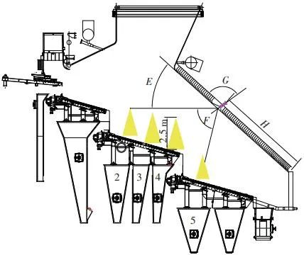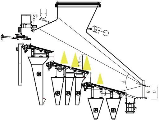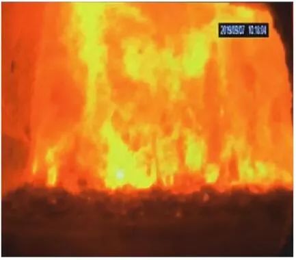 當(dāng)前生活垃圾焚燒爐廣泛采用的爐膛火焰監(jiān)視系統(tǒng)基本上都是由早期應(yīng)用在水泥廠、鋼鐵廠的加熱爐、退火爐和氧化鋁廠等行業(yè)內(nèi)的高溫看火工業(yè)電視演變升級(jí)而來(lái)。內(nèi)窺式數(shù)字高清爐膛火焰監(jiān)視系統(tǒng)成像裝置主要由耐高溫針孔電動(dòng)鏡頭、寶石物鏡、光學(xué)濾光片、光圈焦距調(diào)節(jié)器等組成,配有電控推進(jìn)器、氣源控制柜、光端機(jī)等輔助設(shè)備。其核心問(wèn)題是如何在生活垃圾焚燒爐的高溫、多塵、強(qiáng)腐蝕環(huán)境中長(zhǎng)周期穩(wěn)定運(yùn)行,保證火焰畫(huà)面不丟包、不失真。1)優(yōu)勢(shì)特性分析。一是技術(shù)成熟、運(yùn)行穩(wěn)定。隨著我國(guó)近一二十年間生活垃圾發(fā)電廠的興建,爐膛火焰監(jiān)視系統(tǒng)的技術(shù)也處于不停地優(yōu)化和迭代之中,目前已能滿足穩(wěn)定、可靠的要求。其中常規(guī)配置參數(shù)為攝像頭300 萬(wàn)像素,響應(yīng)時(shí)間2 s,光圈(F數(shù))1.6,焦距2.4 mm。二是工作環(huán)境好。爐膛火焰監(jiān)視器探頭通常安裝于焚燒爐后墻,所處位置是垃圾燃燒最末端,常規(guī)工況下探頭周圍煙氣溫度通常<600 ℃。較之焚燒爐其他高溫環(huán)境已算“宜居地帶”。三是維護(hù)量小。焚燒爐后墻幾乎沒(méi)有結(jié)焦現(xiàn)象,常規(guī)爐膛火焰監(jiān)視探頭開(kāi)孔位置僅存有因爐膛偶爾正壓時(shí)煙氣外冒造成的積灰,積灰量不大,清理工作較為輕松。2)劣勢(shì)特性分析。一是參數(shù)單一。因垃圾焚燒行業(yè)爐型構(gòu)造和燃燒成分的特殊性,垃圾焚燒爐長(zhǎng)期采用的火焰探頭利用的是光學(xué)成像原理,運(yùn)行人員僅能通過(guò)觀察火焰形狀和位置來(lái)判斷焚燒爐工況,無(wú)法得到多維度參數(shù)。二是視角局限。爐膛火焰探頭通常位于焚燒爐后墻,安裝角度朝向爐內(nèi)成斜向上方向,與水平線夾角15°左右,探頭視場(chǎng)角通常>60°。以某大型列動(dòng)順推爐排焚燒爐為例,在此仰視角度下可以看到爐排燃燒段尾部、燃燼段前部?jī)擅婷黠@的火焰幕墻,由于火焰鋒面遮擋,很難觀察到燃燒段中前部的火焰狀況。 以某單臺(tái)750 t/d大型列動(dòng)順推爐排焚燒爐中爐膛火焰監(jiān)視器安裝位置和顯示畫(huà)面為實(shí)例,具體分析火焰成像狀態(tài)。其實(shí)際火焰成像畫(huà)面見(jiàn)圖1。成像角度是由焚燒爐后墻探頭位置向上仰視爐膛。因焚燒工況十分良好,靠近后墻的燃燼段區(qū)域幾乎沒(méi)有明火,燃燒段尾部成一面豎直、光亮的黃紅色火焰鋒面,高度約為2.5 m。對(duì)應(yīng)的爐膛火焰監(jiān)視器安裝示意如圖2所示。爐膛火焰探頭安裝在焚燒爐后墻,安裝位置與后墻觀火平臺(tái)地面距離為C(m)。開(kāi)孔傾角與水平方向夾角為B(°),有效視場(chǎng)角為A(°)。圖2中由黃色填充的三角形區(qū)域代表正常燃燒火焰,其中標(biāo)注高度2.5 m的區(qū)域?yàn)槿紵隣t排尾部火焰,即為圖1所顯示的火焰鋒面。顯然,從爐膛火焰監(jiān)視器向上望去,燃燒段前部、中部火焰為視野盲區(qū)。由于被燃燒段尾部火焰鋒面遮擋,通過(guò)火焰監(jiān)視器通常只能看到燃燒段尾部、燃燼段前部這兩個(gè)區(qū)域的火焰。