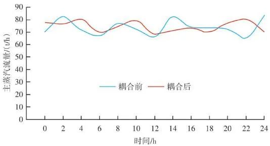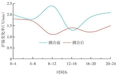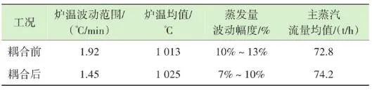 生活垃圾焚燒爐的排放物在滿足GB 18485—2014 生活垃圾焚燒污染控制標(biāo)準(zhǔn)的前提下,為保障焚燒爐的長(zhǎng)期安全運(yùn)行、汽機(jī)系統(tǒng)的穩(wěn)定高效運(yùn)轉(zhuǎn),通常通過(guò)爐溫和主蒸汽流量這兩個(gè)因素來(lái)判斷鍋爐運(yùn)行是否良好。以下工況為某項(xiàng)目單臺(tái)750 t/d生活垃圾焚燒爐在紅外熱成像管理系統(tǒng)應(yīng)用前、應(yīng)用后兩段時(shí)期的實(shí)際運(yùn)行參數(shù),以此實(shí)例來(lái)解析該系統(tǒng)的運(yùn)行效果。該項(xiàng)目額定主蒸汽流量為74 t/h。如圖10所示,藍(lán)色實(shí)線為耦合前24 h變化率波動(dòng)范圍,紅色實(shí)線為耦合后24 h變化率波動(dòng)范圍。爐溫變化率指的是焚燒爐上、中、下3層共計(jì)9個(gè)溫度測(cè)點(diǎn)的熱電偶反饋溫度在每分鐘內(nèi)升高或降低的溫度值,而溫度變化率波動(dòng)范圍指的是單位時(shí)間內(nèi)溫度變化率最高值與最低值之間的溫度差,該差值越大表明爐溫波動(dòng)越大,即工況越不穩(wěn)定,波動(dòng)范圍越小表明工況越平穩(wěn)。此期間溫度也一直未低于環(huán)保部要求的最低限(850 ℃/2 s),均介于950~1 050 ℃。焚燒爐主蒸汽流量曲線如圖11所示,左側(cè)縱坐標(biāo)為主蒸汽流量,額定蒸發(fā)量74 t/h。圖中藍(lán)色實(shí)線為紅外熱成像系統(tǒng)與ACC系統(tǒng)耦合前24 h的主蒸汽流量曲線,紅色虛線為紅外熱成像系統(tǒng)與ACC系統(tǒng)耦合后24 h的主蒸汽流量曲線。表1中參數(shù)可以計(jì)算出耦合前后焚燒爐爐溫波動(dòng)范圍相對(duì)縮減了24.5%,焚燒爐爐溫均值提高了1.2%,蒸發(fā)量波動(dòng)幅度縮減了3個(gè)百分點(diǎn),主蒸汽流量提高了1.4 t/h。經(jīng)過(guò)對(duì)主要運(yùn)行參數(shù)的定量分析,可以看出結(jié)合了紅外熱成像系統(tǒng)的ACC系統(tǒng)在功能性和穩(wěn)定性上有顯著提升。表1 重要運(yùn)行參數(shù)統(tǒng)計(jì)基于目前紅外熱成像管理系統(tǒng)的功能,正在逐步進(jìn)行焚燒爐溫度場(chǎng)重構(gòu)工作,對(duì)于紅外探頭收集的大量溫度點(diǎn)實(shí)時(shí)數(shù)據(jù)進(jìn)行整合并進(jìn)行紅外溫度顯示。傳感器擁有1 440×1 080個(gè)像素,其中每個(gè)像素都有對(duì)應(yīng)的溫度值,該溫度值隨著目標(biāo)溫度的變化在800~1 600 ℃對(duì)應(yīng)變化,那么我們就可以將800~1 600 ℃這個(gè)范圍內(nèi)的溫度數(shù)據(jù)映射到顏色空間中特定的彩色序列,只要在程序中明確規(guī)定溫度和顏色之間的映射函數(shù)和映射表即可實(shí)現(xiàn)相應(yīng)的偽彩顯示,即熱像圖的形式。這樣可為運(yùn)行人員提供更為直觀、立體的參考依據(jù),待溫度場(chǎng)重構(gòu)系統(tǒng)成熟后,再與ACC系統(tǒng)進(jìn)行結(jié)合,進(jìn)一步提高全廠的自動(dòng)化程度。紅外熱成像管理系統(tǒng)在生活垃圾焚燒控制領(lǐng)域,與傳統(tǒng)ACC系統(tǒng)經(jīng)過(guò)合理的設(shè)計(jì)、安裝、邏輯耦合后,對(duì)焚燒自動(dòng)化有以下幾個(gè)方面的改變和提升。1)視野擴(kuò)大。改變探頭安裝位置后,成像角度由仰視變?yōu)楦┮暎貙捔藸t內(nèi)火焰視場(chǎng)角度?;鹧娉上裥螤钣伞耙幻婊饓Α?提升為“一片火海”。在具備最基本的“遠(yuǎn)程看火”功能前提下,為運(yùn)行人員提供更強(qiáng)有力的參考依據(jù)。2)測(cè)溫準(zhǔn)確。紅外熱成像原理相比傳統(tǒng)光學(xué)成像原理,增加了溫度反饋功能。利用軟件管理系統(tǒng),將溫度信號(hào)解析,并與實(shí)際區(qū)域一一對(duì)應(yīng)。3)靈活性高。溫度測(cè)點(diǎn)的選定可通過(guò)管理軟件任意選擇,調(diào)試結(jié)束后仍可根據(jù)實(shí)際工況進(jìn)行設(shè)置和改變。4)耦合性強(qiáng)。紅外熱成像管理系統(tǒng)除現(xiàn)有功能外更像是一個(gè)平臺(tái),可以對(duì)現(xiàn)有溫度參數(shù)和火焰狀態(tài)的大量數(shù)據(jù)進(jìn)行進(jìn)一步提升和利用,例如正在進(jìn)行的溫度場(chǎng)成像功能優(yōu)化和升級(jí)工作。5)效益提升。紅外熱成像管理系統(tǒng)融入ACC系統(tǒng)后,對(duì)焚燒爐溫度、鍋爐主蒸汽流量的穩(wěn)定性有顯著提升。對(duì)減少運(yùn)行人員工作量、增加產(chǎn)汽量、發(fā)電量等焚燒廠經(jīng)濟(jì)效益方面有不同程度提升。