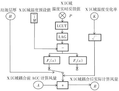根據(jù)工藝設(shè)計(jì)和焚燒爐結(jié)構(gòu),從燃燒段至燃燼段前部為垃圾的燃燒區(qū)域,爐排底部依次有4行風(fēng)室,即圖7中所示2、3、4和5行風(fēng)室,每行各有3列,共計(jì)12個(gè)風(fēng)室。按照前述的項(xiàng)目實(shí)例,圖6中的12個(gè)紅外溫度測(cè)點(diǎn),可以得到依次對(duì)應(yīng)12個(gè)風(fēng)室上部的火焰圖像和燃燒溫度。在傳統(tǒng)ACC系統(tǒng)中,一次風(fēng)的理論供風(fēng)量主要依據(jù)垃圾熱值、垃圾占比、蒸發(fā)量設(shè)定值、鍋爐熱效率等參數(shù)計(jì)算得到,在得到理論計(jì)算值后,會(huì)根據(jù)鍋爐負(fù)荷、垃圾料層厚度、垃圾濕度、燃燒和燃燼段上部溫度等參數(shù)的波動(dòng)對(duì)理論計(jì)算值進(jìn)行修正。其中溫度參數(shù)是由安裝在焚燒爐墻兩側(cè)的熱電偶反饋而來(lái),爐溫?zé)犭娕嫉拈L(zhǎng)度一般為1.0~1.3 m,除去爐墻壁厚,熱電偶露出爐內(nèi)的長(zhǎng)度一般在250 mm左右,熱電偶材質(zhì)為鎳鉻-鎳硅,熱電偶前端耐磨頭長(zhǎng)度為250~300 mm,耐磨頭材質(zhì)為鈷60。由于能夠反饋的溫度只能是熱電偶周圍溫度,因此會(huì)造成3點(diǎn)限制:①測(cè)點(diǎn)數(shù)量有限,若熱電偶數(shù)量增加,鍋爐開(kāi)孔數(shù)量也要隨之上升,通常燃燒和燃燼區(qū)域安裝熱電偶數(shù)量為4~6支;②耦合性較高,抗干擾能力較低,其中的溫度修正系數(shù)雖然權(quán)重占比不大,但由于熱電偶數(shù)量有限,其單一溫度值對(duì)整體其他區(qū)域有連鎖影響,因此局部溫度與局部風(fēng)量無(wú)法一一獨(dú)立對(duì)應(yīng);③準(zhǔn)確性存在衰減,熱電偶的原理是溫度信號(hào)轉(zhuǎn)換成熱電動(dòng)勢(shì)信號(hào),通過(guò)二次儀表呈現(xiàn)被測(cè)介質(zhì)溫度。而隨著磨損、腐蝕的加重,其準(zhǔn)確性也逐漸衰減。其中鎳硅合金中的硅和鎳的優(yōu)先氧化是引起鎳鉻-鎳硅熱電偶熱電動(dòng)勢(shì)超差、準(zhǔn)確性降低的主要原因。根據(jù)上述內(nèi)容,我們?cè)诘玫嚼碚撚?jì)算風(fēng)量之后,針對(duì)每一段風(fēng)室進(jìn)行獨(dú)立的風(fēng)量修正。圖9中:M為對(duì)應(yīng)區(qū)域內(nèi)溫度設(shè)定值(℃);H為垃圾層厚度偏差百分比(%);P為對(duì)應(yīng)區(qū)域內(nèi)溫度實(shí)時(shí)反饋值(℃);K為對(duì)應(yīng)區(qū)域內(nèi)溫度變化率(℃/min);√ ̄為速度變化率高低限范圍(℃/min);LCUT為低切保護(hù)模塊(℃);LAG為高階濾波模塊(℃);A為理論計(jì)算風(fēng)量(m3/h);B為實(shí)際輸出計(jì)算風(fēng)量(m3/h)。