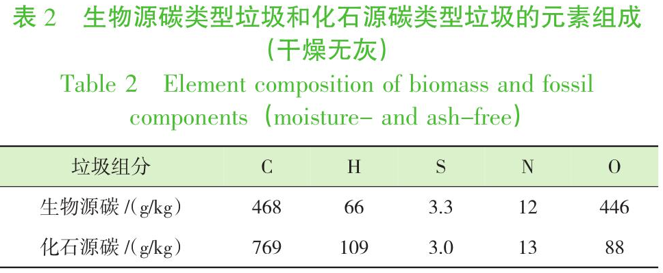 1)本研究的碳排放計算參考了歐洲垃圾組分中的元素含量,而我國生活垃圾組分與歐洲地區(qū)存在差異,其中,我國生活垃圾組分中廚余含量高達(dá)50%,而歐洲地區(qū)垃圾中的廚余含量僅為25%左右。因此,C、H、S、N、O等元素含量參考值對我國不完全適用,計算過程存在低估生物源碳含量的可能性。