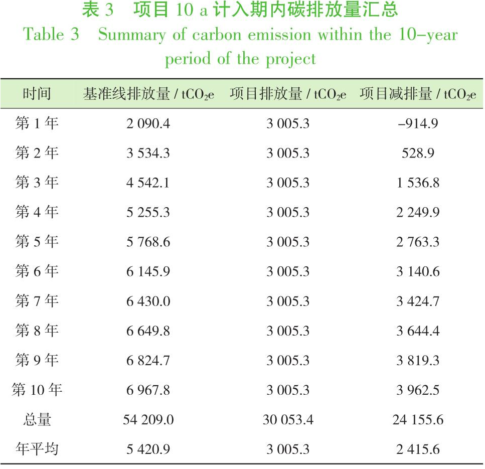 由CCER方法學(xué)計算可得,10 a計入期內(nèi)項目平均每年基準(zhǔn)線排放量為5420.9 tCO2e,總項目排放量為3005.3 tCO2e,總減排量為2415.6 tCO2e。計算得出10 a計入期內(nèi)的項目碳排放量如表3所示。計入期內(nèi)單位垃圾采用焚燒方式處理后的基準(zhǔn)線排放量為0.53 tCO2e/t,項目碳排放量約為0.29 tCO2e/t,碳減排量0.24 tCO2e/t。