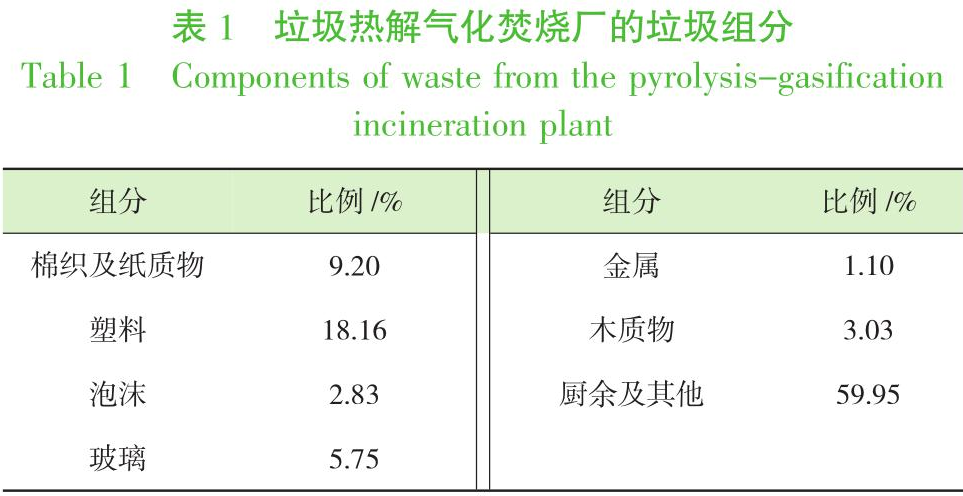 以舟山市某垃圾無害化處理項目為研究對象,該項目的垃圾焚燒系統(tǒng)采用立式旋轉(zhuǎn)熱解氣化焚燒爐對周邊城市生活垃圾及部分工業(yè)可燃垃圾進(jìn)行焚燒處理,處理規(guī)模為28 t/d,無須添加輔助化石燃料;并配建1.8 t/h臥式余熱鍋爐,給水量1.854 t/h,給水溫度20℃,蒸汽壓力0.7 MPa,蒸汽溫度170℃;項目渣產(chǎn)量為3.1 t/d,灰產(chǎn)量為1.44 t/d;垃圾滲瀝液產(chǎn)量為3.5 m3/d,其CODcr濃度為6000 mg/L,垃圾滲瀝液回噴至焚燒爐內(nèi)進(jìn)行處理。該項目新鮮垃圾的含水率為60%,詳細(xì)入爐垃圾組份見表1。