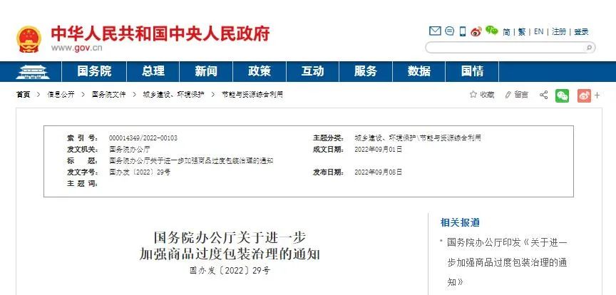國務(wù)院辦公廳關(guān)于進(jìn)一步加強(qiáng)商品過度包裝治理的通知各省、自治區(qū)、直轄市人民政府,國務(wù)院各部委、各直屬機(jī)構(gòu):商品過度包裝是指超出了商品保護(hù)、展示、儲存、運輸?shù)日9δ芤蟮陌b,主要表現(xiàn)為包裝層數(shù)過多、包裝空隙過大、包裝成本過高、選材用料不當(dāng)?shù)?。近年來,各地區(qū)、各部門按照《國務(wù)院辦公廳關(guān)于治理商品過度包裝工作的通知》(國辦發(fā)〔2009〕5號)部署,認(rèn)真推進(jìn)商品過度包裝治理,完善相關(guān)法律法規(guī)標(biāo)準(zhǔn),取得積極進(jìn)展。但治理工作仍存在不少薄弱環(huán)節(jié)和突出問題,尤其是隨著消費新業(yè)態(tài)快速發(fā)展,商品過度包裝現(xiàn)象有“卷土重來”之勢。為貫徹落實黨中央、國務(wù)院決策部署,進(jìn)一步加強(qiáng)商品過度包裝治理,經(jīng)國務(wù)院同意,現(xiàn)就有關(guān)事項通知如下。各地區(qū)、各部門要以習(xí)近平新時代中國特色社會主義思想為指導(dǎo),深入貫徹習(xí)近平生態(tài)文明思想,立足新發(fā)展階段,完整、準(zhǔn)確、全面貫徹新發(fā)展理念,構(gòu)建新發(fā)展格局,推動高質(zhì)量發(fā)展,認(rèn)真貫徹落實固體廢物污染環(huán)境防治法、消費者權(quán)益保護(hù)法、標(biāo)準(zhǔn)化法、價格法等法律法規(guī)和國家有關(guān)標(biāo)準(zhǔn),充分認(rèn)識進(jìn)一步加強(qiáng)商品過度包裝治理的重要性和緊迫性,在生產(chǎn)、銷售、交付、回收等各環(huán)節(jié)明確工作要求,強(qiáng)化監(jiān)管執(zhí)法,健全標(biāo)準(zhǔn)體系,完善保障措施,堅決遏制商品過度包裝現(xiàn)象,為促進(jìn)生產(chǎn)生活方式綠色轉(zhuǎn)型、加強(qiáng)生態(tài)文明建設(shè)提供有力支撐。到2025年,基本形成商品過度包裝全鏈條治理體系,相關(guān)法律法規(guī)更加健全,標(biāo)準(zhǔn)體系更加完善,行業(yè)管理水平明顯提升,線上線下一體化執(zhí)法監(jiān)督機(jī)制有效運行,商品過度包裝治理能力顯著增強(qiáng)。月餅、粽子、茶葉等重點商品過度包裝違法行為得到有效遏制,人民群眾獲得感和滿意度顯著提升。(一)加強(qiáng)包裝領(lǐng)域技術(shù)創(chuàng)新。推動包裝企業(yè)提供設(shè)計合理、用材節(jié)約、回收便利、經(jīng)濟(jì)適用的包裝整體解決方案,自主研發(fā)低克重、高強(qiáng)度、功能化包裝材料及其生產(chǎn)設(shè)備,創(chuàng)新研發(fā)商品和快遞一體化包裝產(chǎn)品。充分發(fā)揮包裝企業(yè)在推廣簡約包裝、倡導(dǎo)理性消費中的橋梁紐帶作用,推動包裝設(shè)計、商品生產(chǎn)等上下游各環(huán)節(jié)踐行簡約適度理念。(工業(yè)和信息化部和各地方人民政府按職責(zé)分工負(fù)責(zé))(二)防范商品生產(chǎn)環(huán)節(jié)過度包裝。督促指導(dǎo)商品生產(chǎn)者嚴(yán)格按照限制商品過度包裝強(qiáng)制性標(biāo)準(zhǔn)生產(chǎn)商品,細(xì)化限制商品過度包裝的管理要求,建立完整的商品包裝信息檔案,記錄商品包裝的設(shè)計、制造、使用等信息。引導(dǎo)商品生產(chǎn)者使用簡約包裝,優(yōu)化商品包裝設(shè)計,減少商品包裝層數(shù)、材料、成本,減少包裝體積、重量,減少油墨印刷,采用單一材料或便于分離的材料。(工業(yè)和信息化部、市場監(jiān)管總局等部門和各地方人民政府按職責(zé)分工負(fù)責(zé))督促商品生產(chǎn)者嚴(yán)格遵守標(biāo)準(zhǔn)化法要求,公開其執(zhí)行的包裝有關(guān)強(qiáng)制性標(biāo)準(zhǔn)、推薦性標(biāo)準(zhǔn)、團(tuán)體標(biāo)準(zhǔn)或企業(yè)標(biāo)準(zhǔn)的編號和名稱。(市場監(jiān)管總局和各地方人民政府按職責(zé)分工負(fù)責(zé))引導(dǎo)醫(yī)療機(jī)構(gòu)針對門診、住院、慢性病等不同場景和類型提出藥品包裝規(guī)格需求。引導(dǎo)藥品生產(chǎn)者優(yōu)化藥品包裝規(guī)格。(國家衛(wèi)生健康委、國家藥監(jiān)局和各地方人民政府按職責(zé)分工負(fù)責(zé))(三)避免銷售過度包裝商品。督促指導(dǎo)商品銷售者細(xì)化采購、銷售環(huán)節(jié)限制商品過度包裝有關(guān)要求,明確不銷售違反限制商品過度包裝強(qiáng)制性標(biāo)準(zhǔn)的商品。加強(qiáng)對電商企業(yè)的督促指導(dǎo),實現(xiàn)線上線下要求一致。鼓勵商品銷售者向供應(yīng)方提出有關(guān)商品綠色包裝和簡約包裝要求。(商務(wù)部、市場監(jiān)管總局和各地方人民政府按職責(zé)分工負(fù)責(zé))督促指導(dǎo)外賣平臺企業(yè)完善平臺規(guī)則,對平臺內(nèi)經(jīng)營者提出外賣包裝減量化要求。(商務(wù)部負(fù)責(zé))督促指導(dǎo)餐飲經(jīng)營者對外賣包裝依法明碼標(biāo)價。(市場監(jiān)管總局和各地方人民政府按職責(zé)分工負(fù)責(zé))(四)推進(jìn)商品交付環(huán)節(jié)包裝減量化。指導(dǎo)寄遞企業(yè)制修訂包裝操作規(guī)范,細(xì)化限制快遞過度包裝要求,并通過規(guī)范作業(yè)減少前端收寄環(huán)節(jié)的過度包裝。鼓勵寄遞企業(yè)使用低克重、高強(qiáng)度的紙箱、免膠紙箱,通過優(yōu)化包裝結(jié)構(gòu)減少填充物使用量。(國家郵政局和各地方人民政府按職責(zé)分工負(fù)責(zé))推行快遞包裝綠色產(chǎn)品認(rè