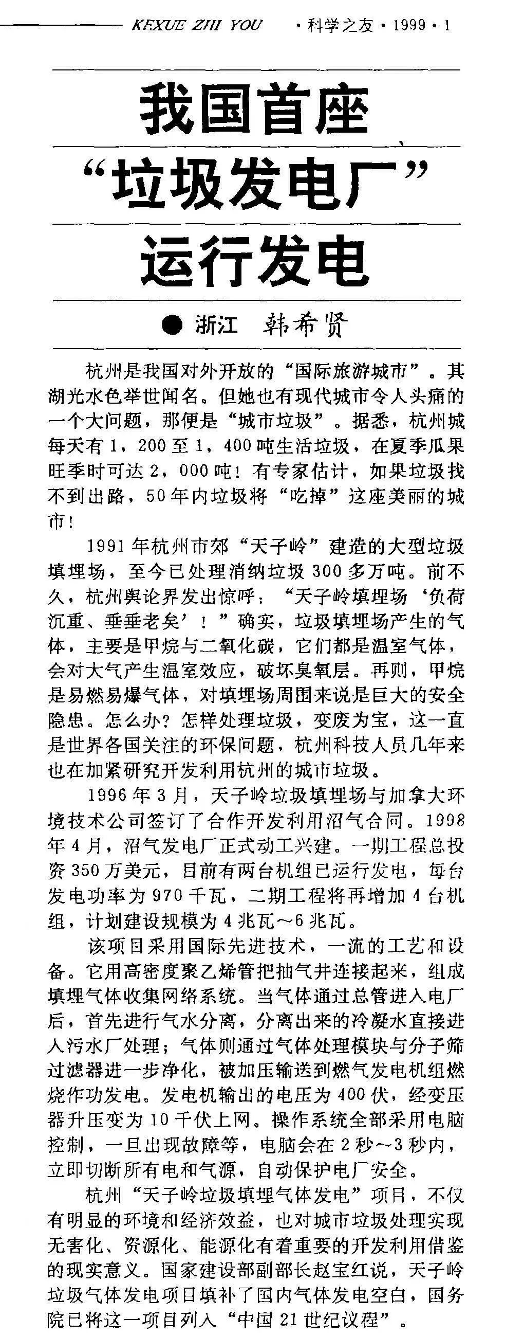 報道原文表示,杭州“天子嶺垃圾填埋氣體發(fā)電”項目不僅有明顯的環(huán)境和經(jīng)濟(jì)效益,也對城市垃圾處理實(shí)現(xiàn)無害化、資源化、能源化有著重要的開發(fā)利用借鑒的現(xiàn)實(shí)意義。時任原建設(shè)部副部長的趙寶紅說,天子嶺垃圾氣體發(fā)電項目填補(bǔ)了國內(nèi)氣體發(fā)電空白,國務(wù)院已將這一項目列入“中國21世紀(jì)議程”。