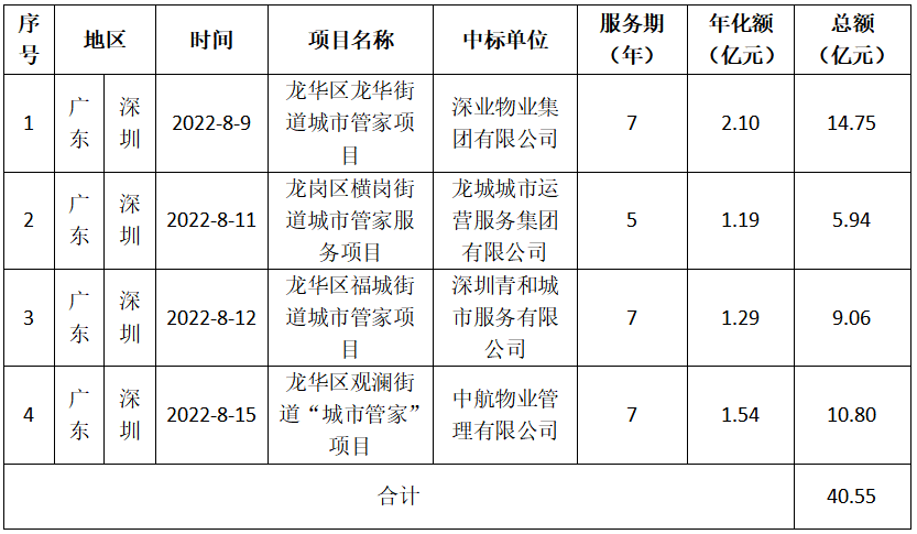 據(jù)環(huán)衛(wèi)科技網(wǎng)粗略統(tǒng)計(jì),今年盈峰環(huán)境已中標(biāo)50余個(gè)環(huán)衛(wèi)項(xiàng)目,總金額突破70億元;僑銀股份則中標(biāo)了40余個(gè)環(huán)衛(wèi)項(xiàng)目,總金額超過(guò)67億元。前8個(gè)月二者你追我趕,輪番登頂年度排行榜。● 深圳批量生產(chǎn)“城市管家”,多家企業(yè)借機(jī)登榜8月,深圳又扎堆釋放了一批“城市管家”項(xiàng)目。這些項(xiàng)目體量大、服務(wù)周期長(zhǎng)、金額高,服務(wù)內(nèi)容涉及垃圾清運(yùn)和清掃保潔(含城市家具保潔)、綠化管養(yǎng)、市政公廁管養(yǎng)、非市政道路路燈管養(yǎng)、市容巡查服務(wù)、節(jié)日燈籠國(guó)旗等裝飾物懸掛、“四害”消殺、垃圾分類和減量服務(wù)等多維度領(lǐng)域。深業(yè)物業(yè)、中航物業(yè)和青和城服都憑借斬獲“城市管家”項(xiàng)目登上月度榜單。