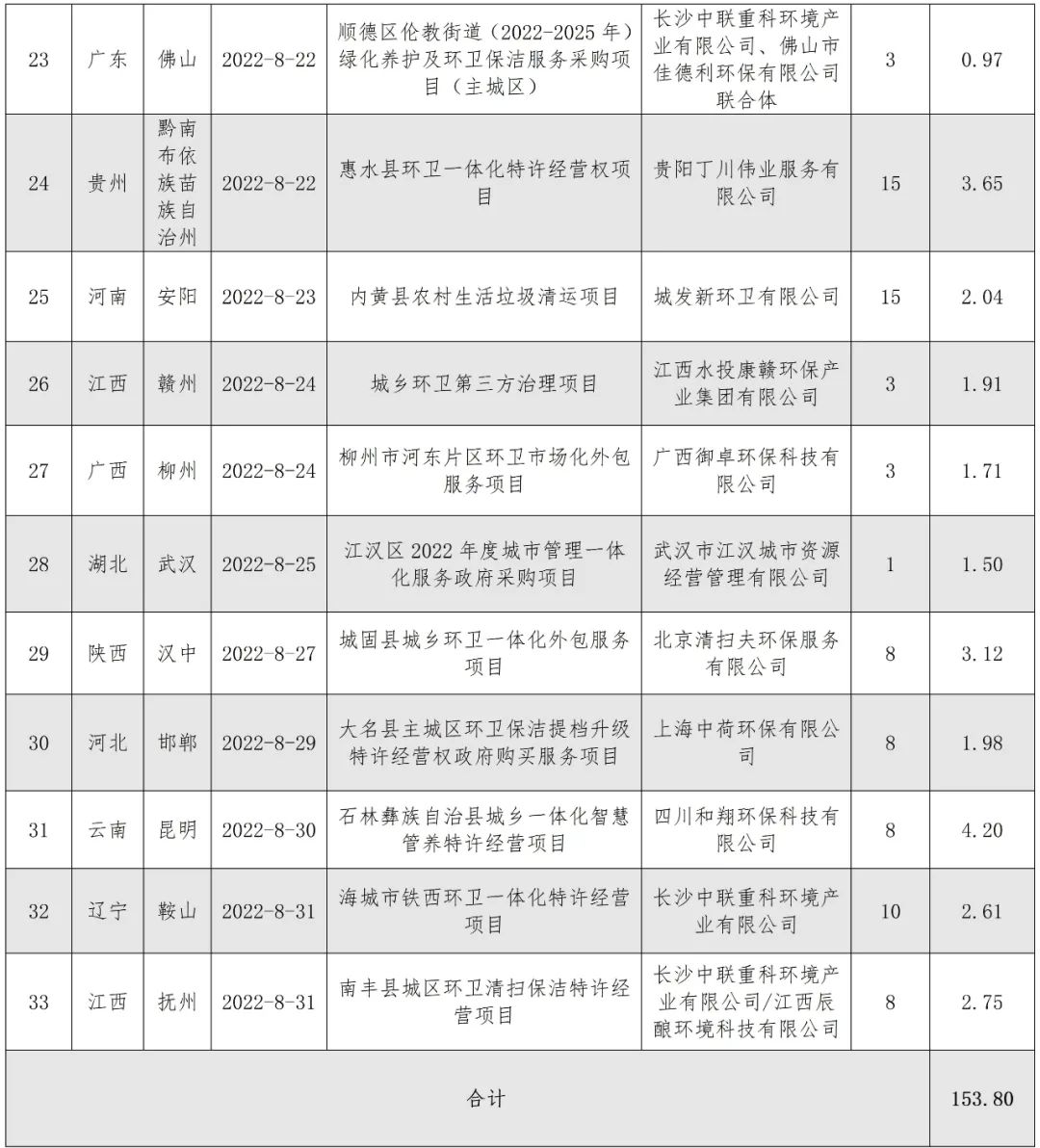 來(lái)源 | 環(huán)衛(wèi)科技網(wǎng)1、項(xiàng)目總額突破150億元,數(shù)量和金額均為年度第二!