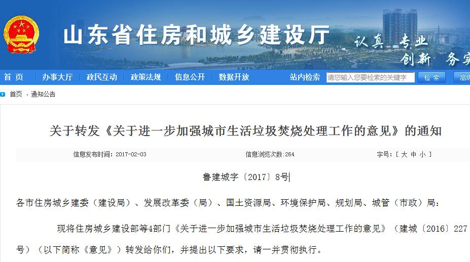 北極星節(jié)能環(huán)保網(wǎng)訊:北極星節(jié)能環(huán)保網(wǎng)獲悉,近日山東省住房和城鄉(xiāng)建設廳、山東省住房和城鄉(xiāng)建設廳、山東省發(fā)展和改革委員會以及山東省國土資源廳山東省環(huán)境保護廳聯(lián)合發(fā)布關(guān)于轉(zhuǎn)發(fā)《關(guān)于進一步加強城市生活垃圾焚燒處理工作的意見》的通知,通知提到,原則上,全省新上城市生活垃圾處理項目,要一律選擇焚燒(發(fā)電)處理技術(shù),現(xiàn)有生活垃圾處理設施預期使用年限小于5年的市、縣,要立即啟動生活垃圾焚燒處理設施項目選址、環(huán)評、立項、土地征用、規(guī)劃等前期工作,條件成熟的盡快開工建設。