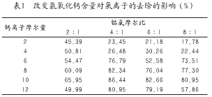 通過上述實驗內(nèi)容的研究,對該方法中氯離子去除效果進行深入分析,以供參考。采用控制變量法研究體系中氫氧化鈣摩爾含量對氯離子去除效果的影響,具體做法是將投入到反應體系中的偏鋁酸鈉中和水體中氯的摩爾比控制為2∶1、4∶1、6∶1、8∶1,從而改變單一變量氫氧化鈣的加入量,探究其摩爾含量對氯離子去除效果的影響,探究結果如表1所示: