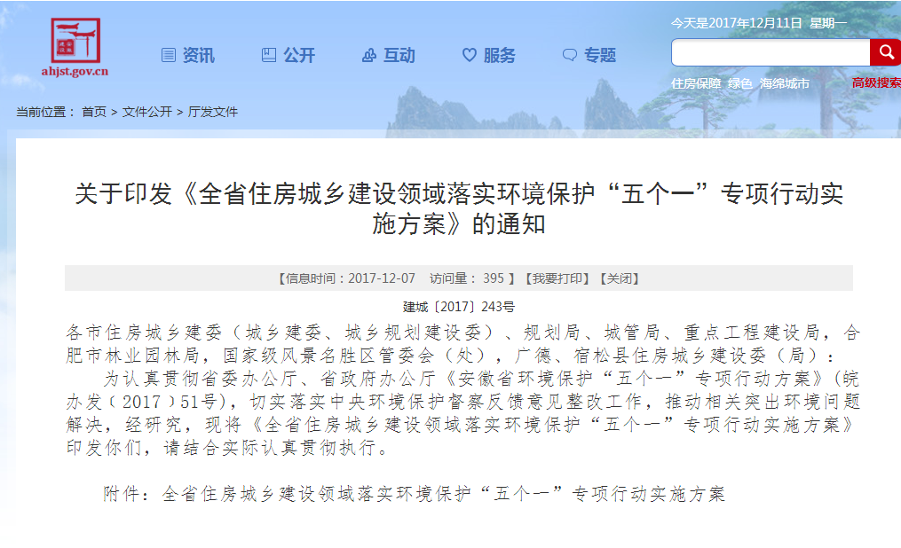 近日,安徽省住建廳發(fā)布關(guān)于印發(fā)《全省住房城鄉(xiāng)建設(shè)領(lǐng)域落實(shí)環(huán)境保護(hù)“五個(gè)一”專項(xiàng)行動(dòng)實(shí)施方案》的通知,切實(shí)推動(dòng)環(huán)境問題的解決。方案全文如下: