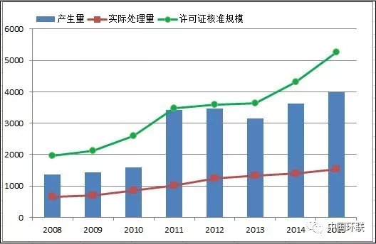 2008~2015年危廢許可證規(guī)模、產(chǎn)生量與實(shí)際經(jīng)營規(guī)模對比趨勢圖