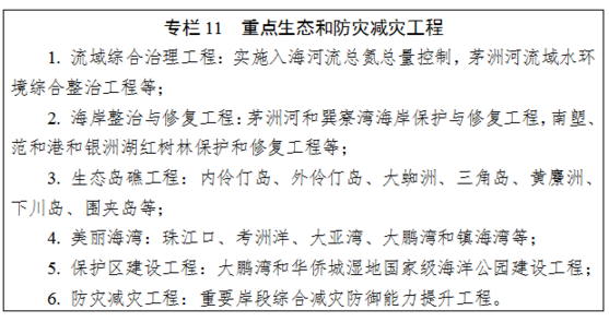 灣區(qū)重點開展海陵灣和程村紅樹林保護和修復工程;推進海陵島生態(tài)島礁工程;推動海陵島和陽西月亮灣國家級海洋公園建設工程;開展陽江核電站、陽江港海洋災害防御能力提升工程。