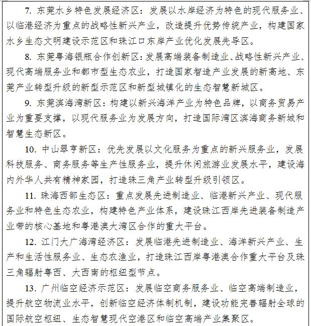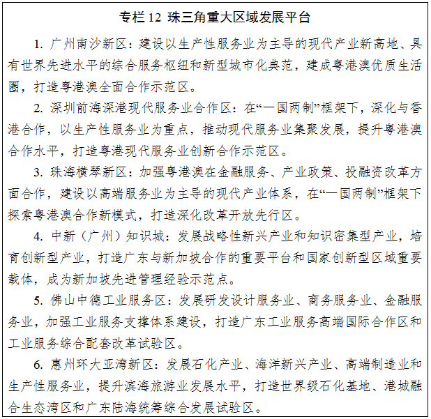 產(chǎn)業(yè)發(fā)展。積極落實粵港澳大灣區(qū)發(fā)展戰(zhàn)略,發(fā)揮深圳、廣州龍頭帶動作用,大力推進廣深科技創(chuàng)新走廊建設,形成高度發(fā)達的創(chuàng)新經(jīng)濟帶,輻射帶動全省創(chuàng)新發(fā)展。打造全球產(chǎn)業(yè)創(chuàng)新高地,建設具有國際影響力的戰(zhàn)略性新興產(chǎn)業(yè)高地、信息經(jīng)濟高地、智能制造高地,重點布局在深圳、廣州、珠海等地。建設世界級先進的電子信息、裝備制造、石化等產(chǎn)業(yè)基地,重點布局在佛山、惠州、東莞、中山、江門等。重點打造全球金融中心、全球貿易中心、全球物流中心、國際化的消費中心、世界休閑旅游中心,主要布局在廣州、深圳。大力發(fā)展廣深珠高端制造業(yè),支持珠海培育智能制造和戰(zhàn)略性新興產(chǎn)業(yè),帶動珠江西岸產(chǎn)業(yè)發(fā)展。大力建設佛山和東莞科技成果轉化基地。建設惠州、中山、江門等區(qū)域生產(chǎn)制造基地。加快構筑區(qū)域發(fā)展重大平臺。建設南海油氣資源勘探開發(fā)保障基地,加快推進天然氣水合物產(chǎn)業(yè)發(fā)展;推動江門循環(huán)經(jīng)濟和環(huán)保產(chǎn)業(yè)示范區(qū)建設;在港口、桂山、金灣等海域發(fā)展海上風電。