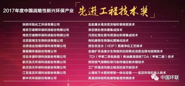 2017年下半年,中國(guó)環(huán)聯(lián)面向全國(guó)征集 “戰(zhàn)略性新興環(huán)保產(chǎn)業(yè)先進(jìn)工程技術(shù)”,以企業(yè)上報(bào)資料為依據(jù),經(jīng)群眾投票與專家評(píng)審,共有10項(xiàng)工程技術(shù)獲得“中國(guó)戰(zhàn)略性新興環(huán)保產(chǎn)業(yè)先進(jìn)工程技術(shù)獎(jiǎng)”。