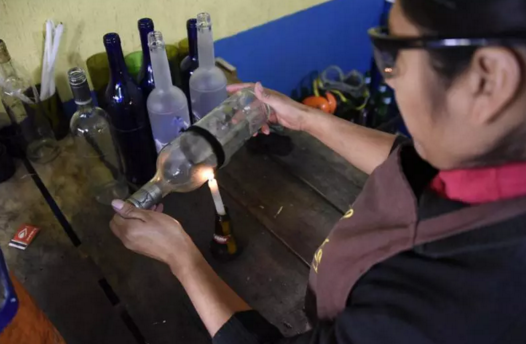 在危地馬拉首都危地馬拉城的一個工廠,一名婦女把回收的廢玻璃瓶重新制成可以在超市出售的玻璃杯和花瓶等,實現(xiàn)廢物利用