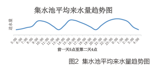 二十四小時(shí)平均進(jìn)水量趨勢(shì)圖如圖2所示,從圖可以看出,在早上7點(diǎn)左右進(jìn)水量逐漸增大,當(dāng)?shù)竭_(dá)十一點(diǎn)左右到達(dá)第一次峰值。這是由于人們?cè)缟嫌盟吭龃?,通常情況下早上七點(diǎn)左右為用水高峰,而通過管網(wǎng)的延時(shí),導(dǎo)致進(jìn)水量在十點(diǎn)左右到達(dá)高峰。同樣的十三點(diǎn)和第二天零點(diǎn)分別是兩次進(jìn)水高峰。第三次高峰段的延長(zhǎng)是由于這段時(shí)間人們生活所致,例如晚飯時(shí)間用水及洗澡時(shí)間的用水等造成水量的持續(xù)高峰。