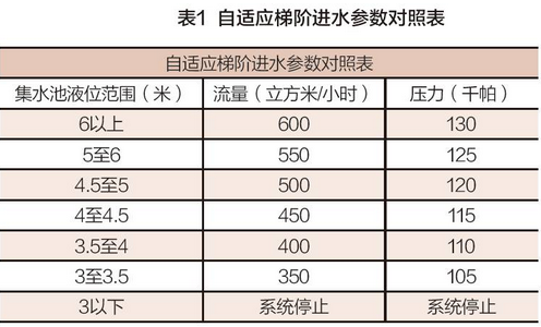 表1是本系統(tǒng)中梯階自適應(yīng)液位與流量壓力的參數(shù)對(duì)照表。這里的壓力與流量是對(duì)應(yīng)的,其壓力是根據(jù)膜的參數(shù)信息進(jìn)行對(duì)照查詢所得。液位與流量則是通過粗略計(jì)算和實(shí)驗(yàn)矯正所得。當(dāng)集水池液位大于6米時(shí),存在溢出風(fēng)險(xiǎn),這個(gè)時(shí)候系統(tǒng)滿負(fù)荷運(yùn)行。當(dāng)?shù)陀?米時(shí),為了防止提升泵干抽,我們將停止系統(tǒng)運(yùn)轉(zhuǎn)。