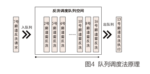 這里我們采用隊(duì)列法來處理廊道競(jìng)爭(zhēng)問題。隊(duì)列法是一種遵循先進(jìn)先出原則的調(diào)度方法。具體原理如圖4所示。隊(duì)列調(diào)度由入隊(duì)列、出隊(duì)列和調(diào)度隊(duì)列空間三部分組成。入隊(duì)列是根據(jù)廊道反洗請(qǐng)求情況將有反洗需求的廊道壓入到隊(duì)列空間的過程。出隊(duì)列則是根據(jù)當(dāng)前的反洗設(shè)備的運(yùn)行狀況將需要反洗的廊道彈出隊(duì)列的過程。反洗調(diào)度隊(duì)列空間即扮演一個(gè)存儲(chǔ)調(diào)度序列的角色,同時(shí)其還具有優(yōu)化和排布序列的功能。