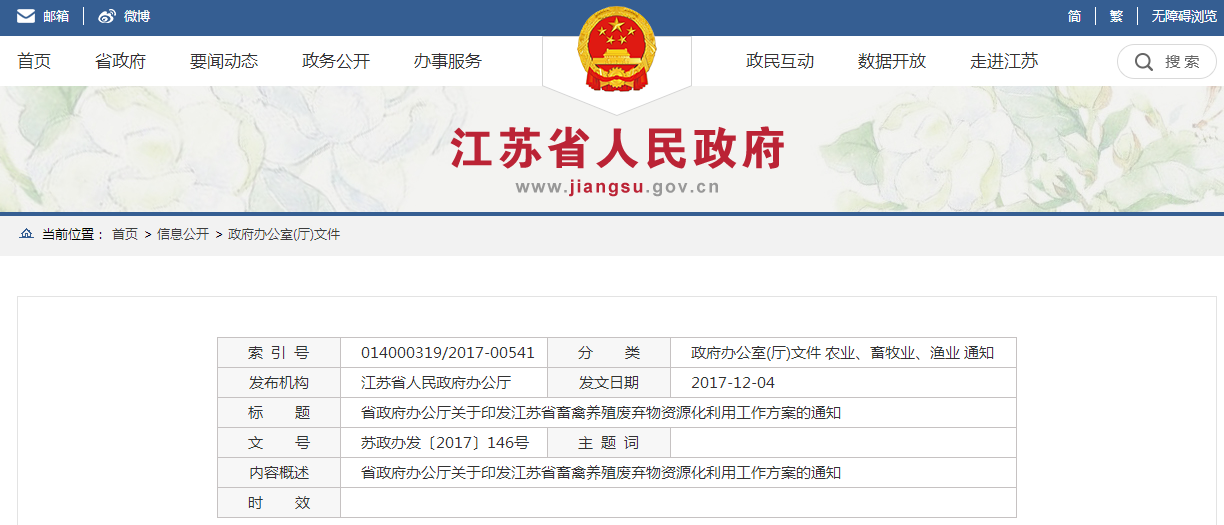省政府辦公廳關(guān)于印發(fā)江蘇省畜禽養(yǎng)殖廢棄物資源化利用工作方案的通知