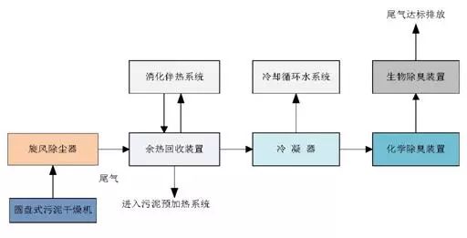 熱量回收系統(tǒng)時本次設(shè)計的重點,熱干化系統(tǒng)尾氣處理工藝流程圖如下。