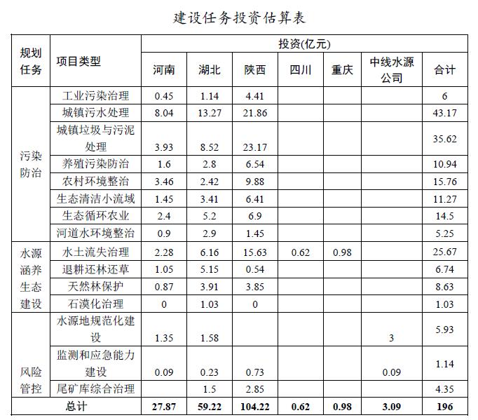 按任務(wù)類型分,水污染防治類投資142.51億元,水源涵養(yǎng)生態(tài)建設(shè)類投資42.07億元,風(fēng)險(xiǎn)管控類投資11.42億元。
