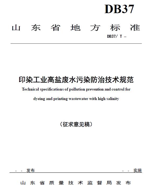 日前,山東環(huán)保廳印發(fā)《印染工業(yè)高鹽廢水污染防治技術(shù)規(guī)范(征求意見稿)》。本標準規(guī)定了印染行業(yè)高鹽廢水治理工程設(shè)計、施工、驗收、運行與維護等的技術(shù)要求。全文如下: