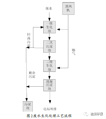 由圖2可知:通過鼓風(fēng)機曝氣和生物膜的處理方法進行二次生化處理,將經(jīng)過處理后的廢水通過污水提升泵輸送到一級的生化池中,該氣浮在進水之前,需要進行二次沉淀,與回流的污泥充分的接觸,進而形成活性的污泥。污泥與污水混合后,再從曝氣的鼓風(fēng)機中獲取足夠的氧(必須是溶解氧),進行硝化反應(yīng),使混合液中的可溶性有機物被具有活性的污泥吸附,從而達到微生物降解的目的,此時的化學(xué)需氧量(COD)已經(jīng)被去除75%。