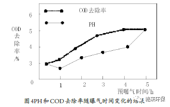 (二)預(yù)曝氣與COD去除的結(jié)果與分析:根據(jù)上述參數(shù)的設(shè)定,對預(yù)曝氣環(huán)節(jié)進行測定,其PH和COD去除率會隨著曝氣時間的推移而發(fā)生改變,結(jié)果如圖4所示。