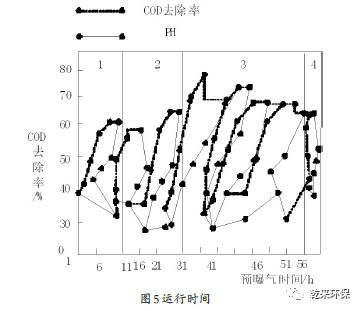 通過適量的預(yù)曝氣,能夠去除廢水中的污染物,從而提升PH值。適當(dāng)?shù)目刂茀?shù)有助于難生物降解的COD轉(zhuǎn)化為易生物降解的COD,為了提高在這四個階段的COD去除效果,可以將第二階段的運行時間加長,如圖5所示。