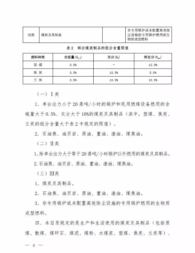 第Ⅰ類,考慮到中西部地區(qū)部分城市煤炭使用還存在規(guī)模化水平不高的現(xiàn)象,從鼓勵(lì)煤炭清潔利用角度,提出單臺(tái)出力小于20蒸噸/小時(shí)的鍋爐和民用燃煤設(shè)備燃用的含硫量大于0.5%、灰分大于10%的煤炭納入禁燃范圍。其中,型煤、焦炭、蘭炭的揮發(fā)分含量不能大于12%、5%和10%,對(duì)型煤的灰分含量沒有要求。
