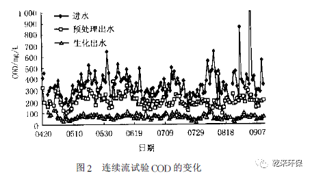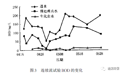 從圖3 可知,生化處理后出水的BOD 也相當(dāng)平穩(wěn),最大值為12. 5 mg/L,平均值為6. 9 mg/L。總處理率為94. 1 % 。