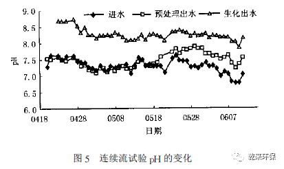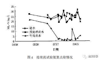 2. 4. 2 氨氮的去除:從圖4 可知,在6 月24 日之前,系統(tǒng)幾乎沒有去除氨氮的效果,且經(jīng)常出現(xiàn)出水氨氮略高于進(jìn)水的情況。為了強(qiáng)化硝化效果,24 日起將生化段的停留時間從12H延長至16H 。改變系統(tǒng)后的第一個星期情況沒有什么變化,從7 月2 日開始明顯出現(xiàn)了生物脫氮的跡象,到了7 月10 日,生物脫氮效果明顯,出水氨氮小于5 mg/L。7 月23 日后達(dá)到了很好的生物硝化效果。此后氨氮的平均出水濃度只有2. 9 mg/L,去除率達(dá)88. 8 % 。