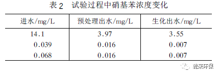 由表1可見,該預(yù)處理工藝有較好的除磷效果,經(jīng)生化處理后PO3 +4達(dá)到二級排放的水平。另外由表2 可見預(yù)處理對硝荃苯的去除也有很好的效果。