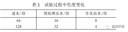2. 4. 5 預(yù)處理對鐵和色度的去除:通常鐵鹽可以改善活性污泥的沉降性能。在本次試驗(yàn)中發(fā)現(xiàn),生物膜的固著性能大大提高,大量的生物膜固定在懸浮填料上,使曝氣池中幾乎無懸浮污泥,處理水清沏透明。經(jīng)過曝氣池,F(xiàn)e2 + 被氧化成Fe3 + ,沉淀去除。試驗(yàn)測得生化段出水總鐵離子濃度為3. 85—8. 55mg/L,滿足二級排放要求。催化鐵內(nèi)電解法具有顯著的脫色效果(見表3 )。